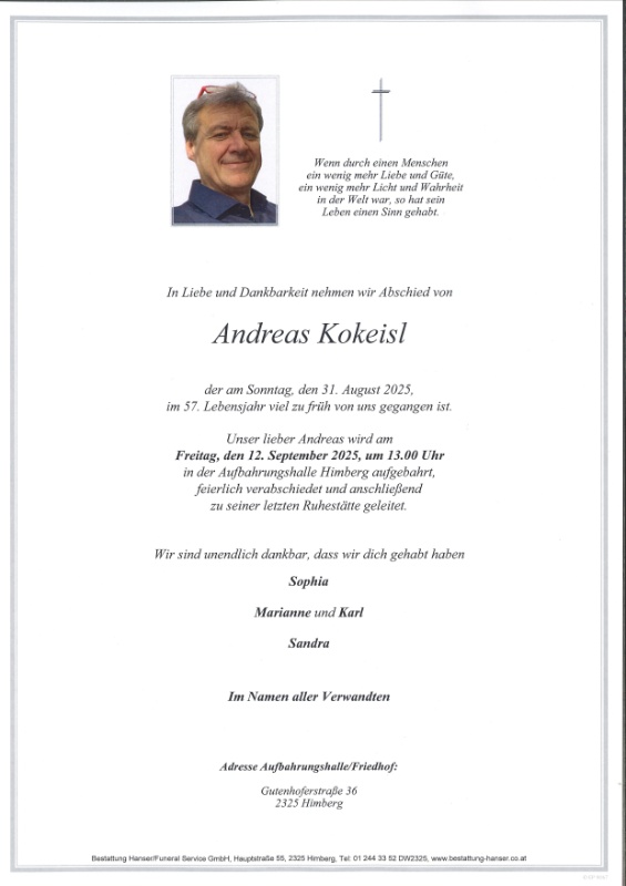 Liebe Trauerfamilie! Ich, ein ehemaliger Arbeitskollege aus PetroChemieDanubia-Zeiten (nun Borealis) möchte Ihnen mein Beileid aussprechen. Der Andi war auch damals ein liebenswerter, hilfsbereiter Mensch. Schade, das er schon so früh von dieser Welt gehen mußte. Ich wünsch Ihnen unbekannter Weise viel Kraft in dieser schweren Zeit.