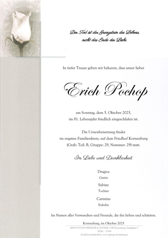 Die Erinnerungen bleiben Deine guten Taten sind gegenwärtig Deine Lieben trauern um dich Du hast dein Werk beendet und mögest in Frieden ruhen,. Erich mein Cousin, ich bin in Gedanken bei dir und deinen trauernden Angehörigen. Paul
