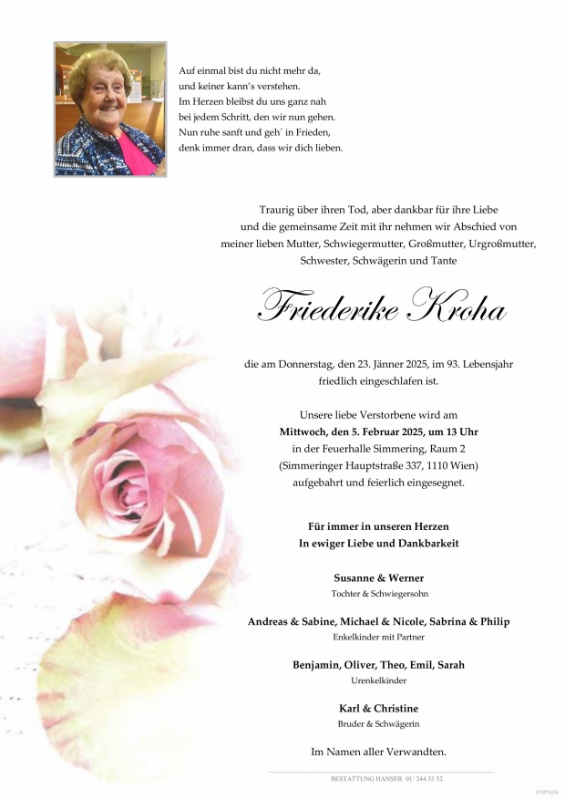 Leider habe ich von Tante Fritzis Ableben durch Zufall heute erfahren…. Mein herzliches Beileid 🖤Auch wenn schon länger kein Kontakt bestand, denke ich sehr oft an euch. Habe auch schon versucht, dich liebe Susi zu kontaktieren/zu finden…. Konnte aber niemanden fragen (vielleicht möchtest du dich bei mir melden .. Brigitte.1965@gmail.com …. Lg gitti