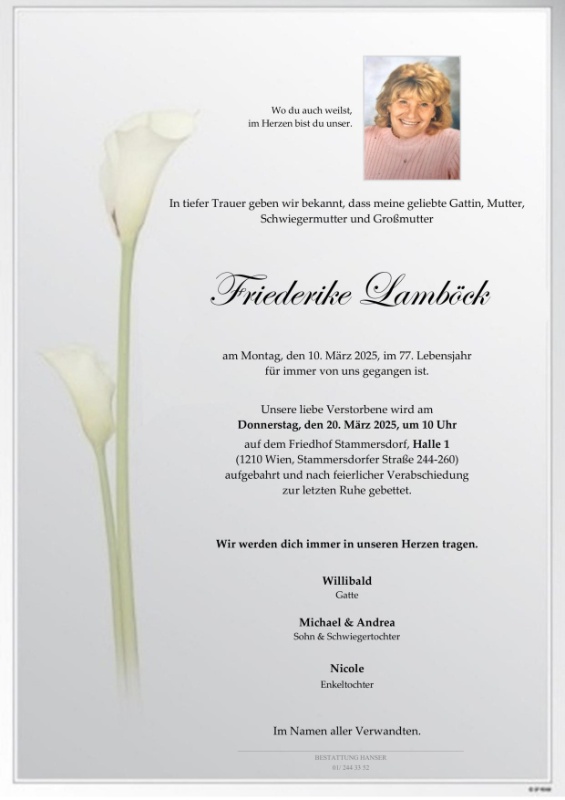 wir wünschen Ihnen für die kommende Zeit viel Kraft und dass es Ihnen gelingt, dankbar auf die positiven Erinnerungen zurückzublicken. Diese Gedenkseite möge Ihnen dabei helfen, Ihre Trauer zu teilen und das Andenken gemeinsam wachzuhalten.
