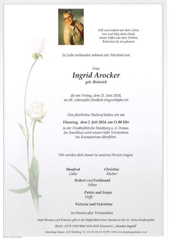 Die Welt hat einen wunderbaren Menschen verloren, der Himmel hat einen neuen Engel bekommen. Wohin du nun auch gehst, liebe Ingrid du bleibst für in unseren Herzen. Ein letztes Lebewohl. 😢🌹