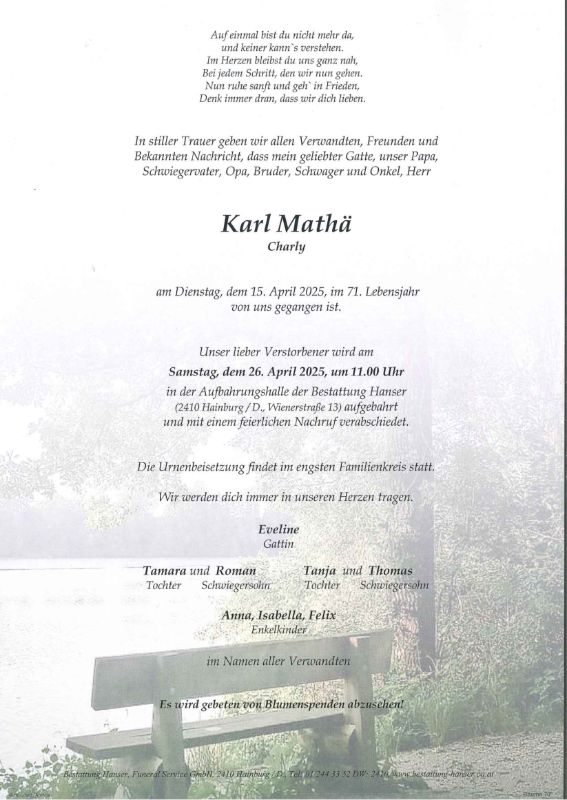 Begrenzt ist das Leben, doch unendlich ist die Erinnerung, und wenn wir an dich denken ,lächeln wir und sagen ,, Weisst du noch?" Ruhe in Frieden!